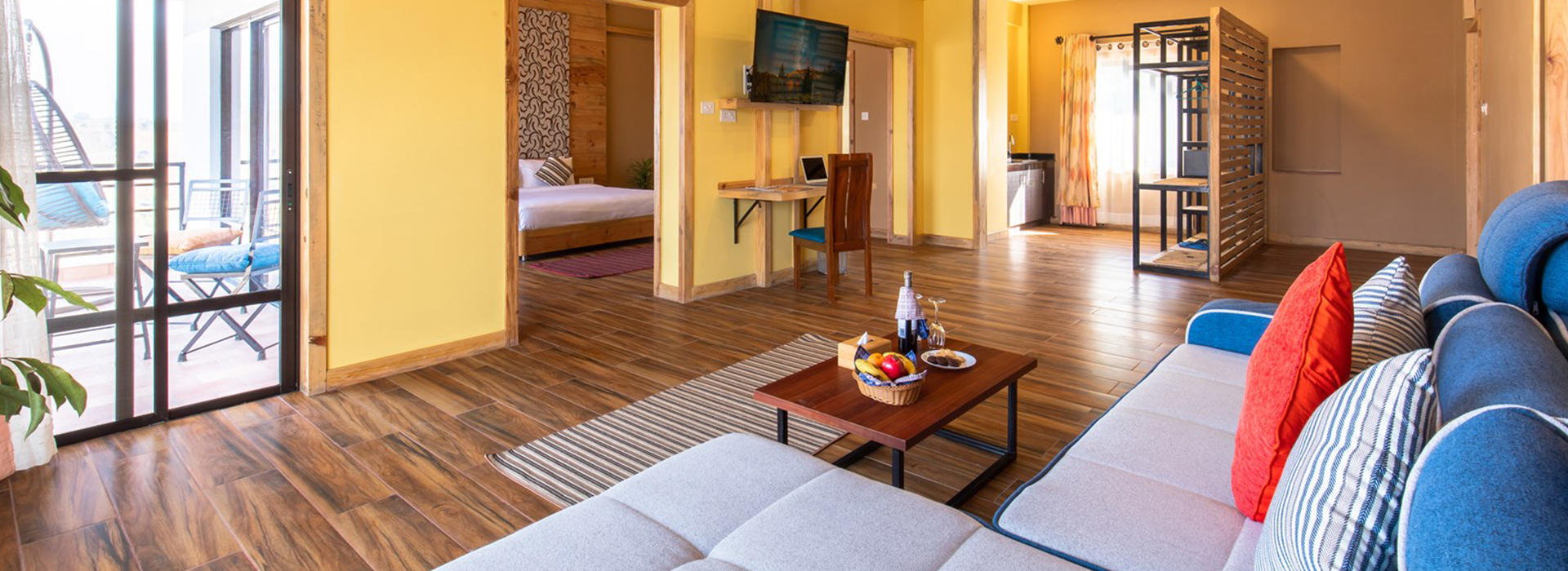 With an inbuilt large private balcony overlooking the garden, the pool, river and the mountains beyond. A king size bed, a rocking chair, large sitting area, a free-standing bathtub, and an outdoor shower.