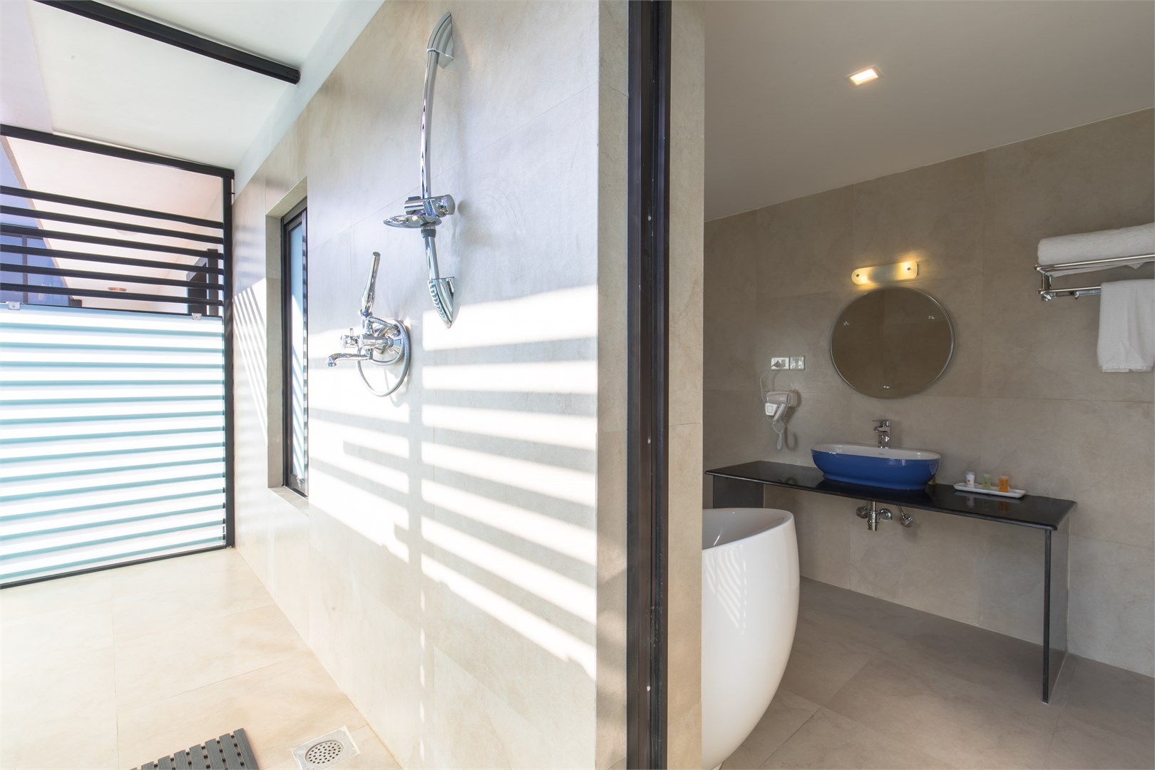 With an inbuilt large private balcony overlooking the garden, the pool, river and the mountains beyond. A king size bed, a rocking chair, large sitting area, a free-standing bathtub, and an outdoor shower.